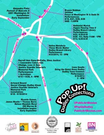 Partners on “Pop Up! Dudley Connections” include Discover Roxbury, Dudley Square Main Streets, Department of Neighborhood Development, Boston Parks & Recreation Department, The Boston Public Library, Bryana Siobhan, Helina Metaferia, Alejandro Pinto, Artward Bound with Fish McGill and Carolyn Lewenberg of Massachusetts College of Art & Design, Darrell Ann-Gane McCalla, James Ovid Mustin, Ricardo Gomez, and Thomas Burns with Alliger Arts, Irene Smalls, and Nathaniel Wyrick.